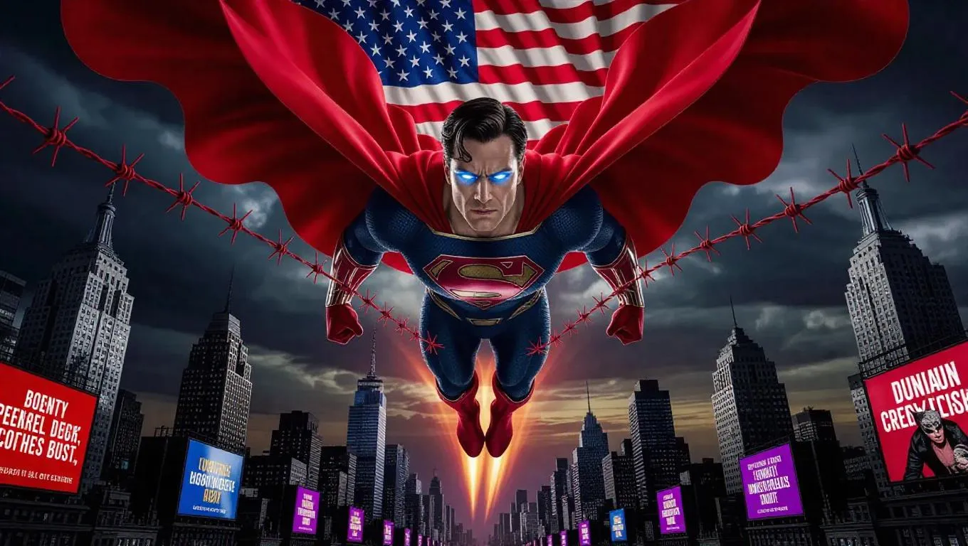 Homelander hovers menacingly above a smoldering metropolis, his crimson cape billowing like liquid blood against storm-charged skies. Twin heat-vision beams scorch the air, refracting through shattered skyscraper glass into prismatic death rays. His sculpted jawline tightens with barely contained rage, cobalt-blue irises flickering nuclear white at the edges. The American flag draped behind him melts, golden threads unraveling into barbed wire coiling around his armored boots. Neon billboards warp, their ads twisting into propaganda slogans mid-collapse. Terrified reflections fractalize across his chrome-plated chest emblem, faces stretched in silent screams. Toxic sunlight bleaches the ruins below into ashen monochrome, except for the violent red glow radiating from his clenched fists.