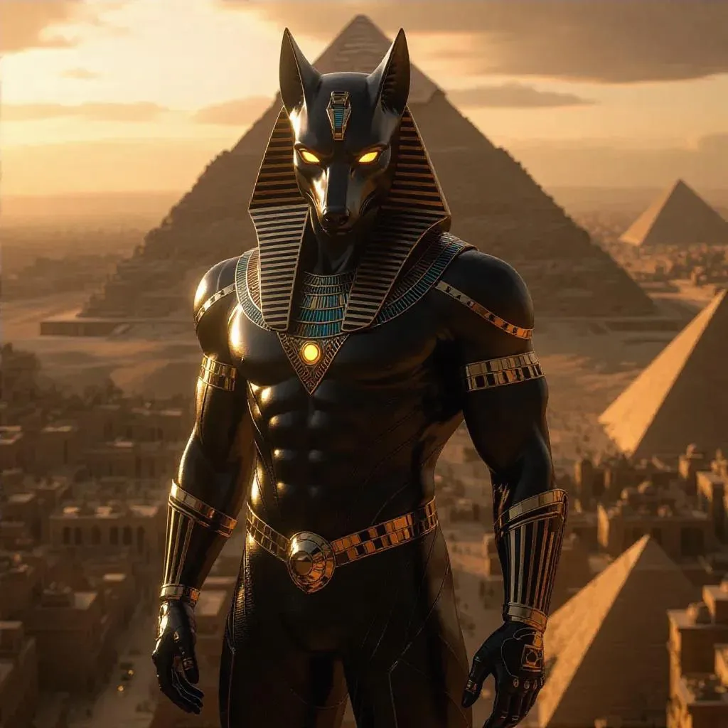 Futuristic Egyptian metropolis meets AI-generated art: envision a cybernetic Anubis deity in gold-tech armor overlooking a neon-lit pyramid city. Ancient motifs blend with futuristic materials, featuring glowing jackal masks, metallic bracers, and holographic temple-inspired skyscrapers. Perfect for sci-fi Egyptology themes, blending pharaonic grandeur with advanced tech aesthetics in vivid AI visuals.