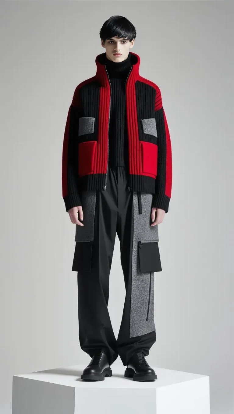 Create AI-generated male models for the 2025-2026 Fall-Winter collections with vivago.ai. Design modern sportswear in red, black, and gray—futuristic knitwear, combed cotton jackets, and wide-leg trousers. Optimize full-body shots on white podiums using AI image generation tools for sleek, professional campaigns. Perfect for fashion designers seeking cutting-edge, trend-driven visuals.