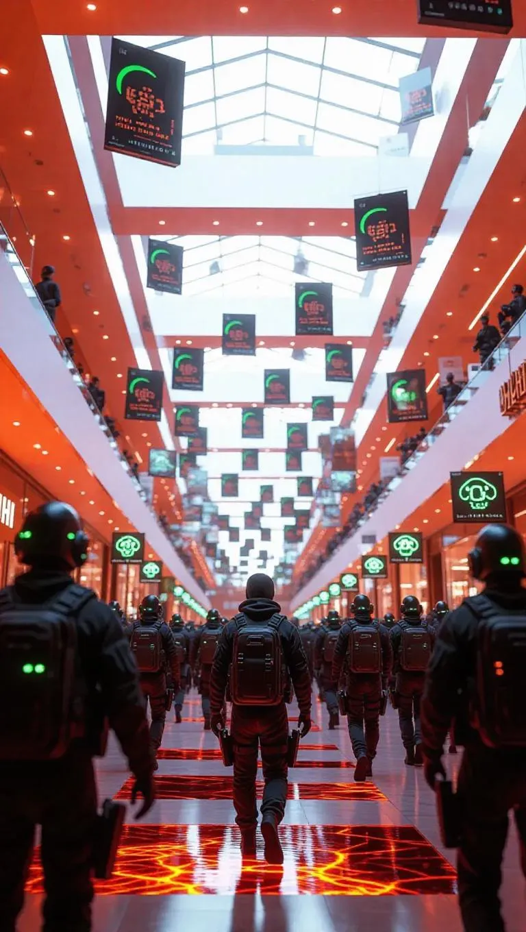 Vivid AI-generated surreal thriller scene of a disguised protagonist chased by high-tech security in a holographic mall. Magma erupts through cracked floors, blending white neon lights with crimson glow. 4K cinematic visuals, Octane-rendered textures, and dynamic lighting contrast intensify the chaotic pursuit. Perfect for sci-fi narratives and high-stakes action concept art.