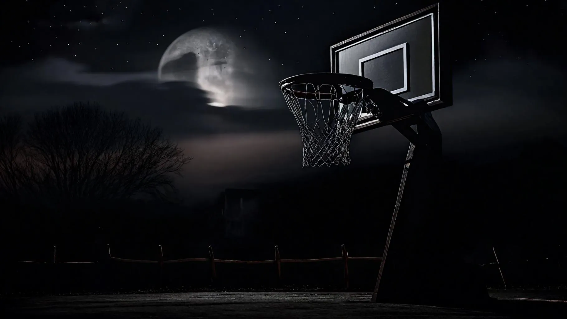Transform text into striking visuals with vivago.ai's AI image generator. Create a towering black basketball hoop with billowing white net against a dark night sky. Generate dramatic shadows, atmospheric backdrops, and moody sports scenes. Elevate your creative projects with AI-powered effects and professional editing tools.