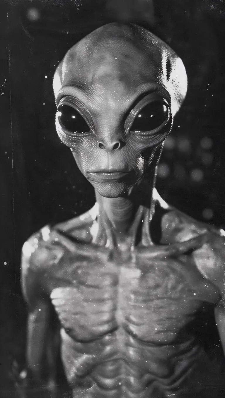 a grainy 1950s era video still of a grey alien. candid and imperfect angle. distortions on the edge of the frame. russian language watermarks. monochrome