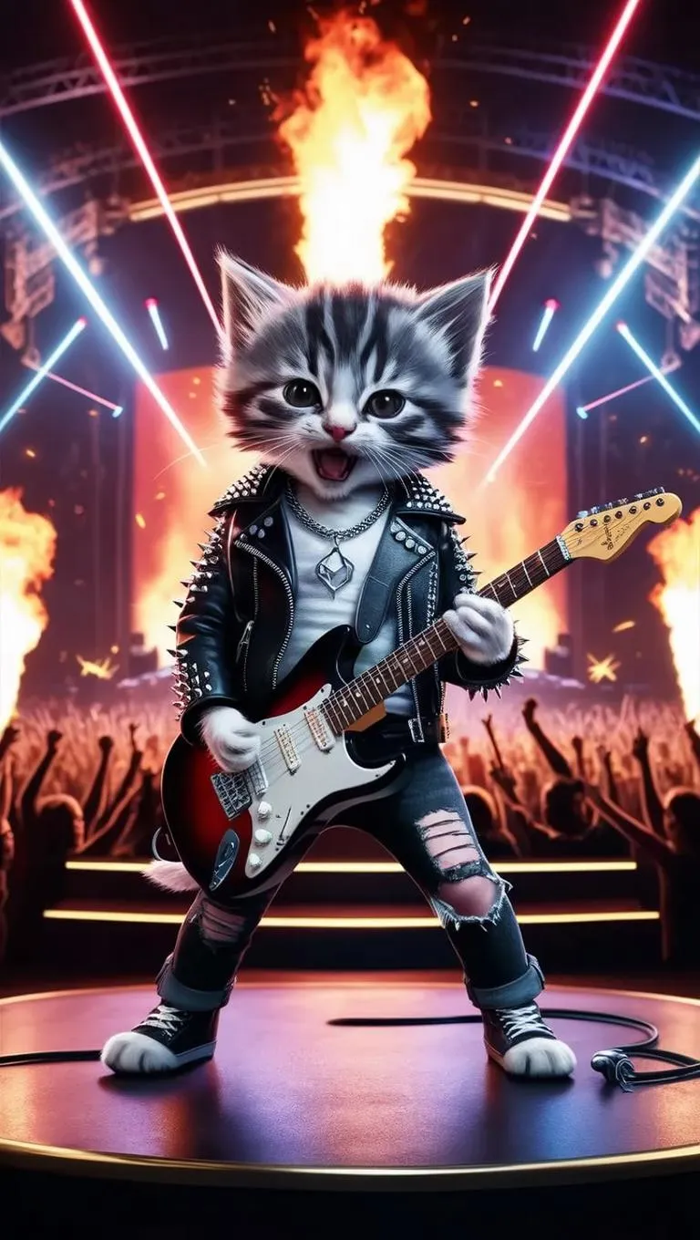 VivaGo AI crafts hyperrealistic 16K AI art of a rebellious kitten rockstar shredding an electric guitar in a leather jacket, ripped jeans, and bold concert pyrotechnics. Experience vivid ray tracing, laser-lit stages, and dynamic crowds with AI-powered precision. Transform text into electrifying visuals—professional-grade rockstar vibes, dramatic lighting, and hyper-detailed textures in every render.