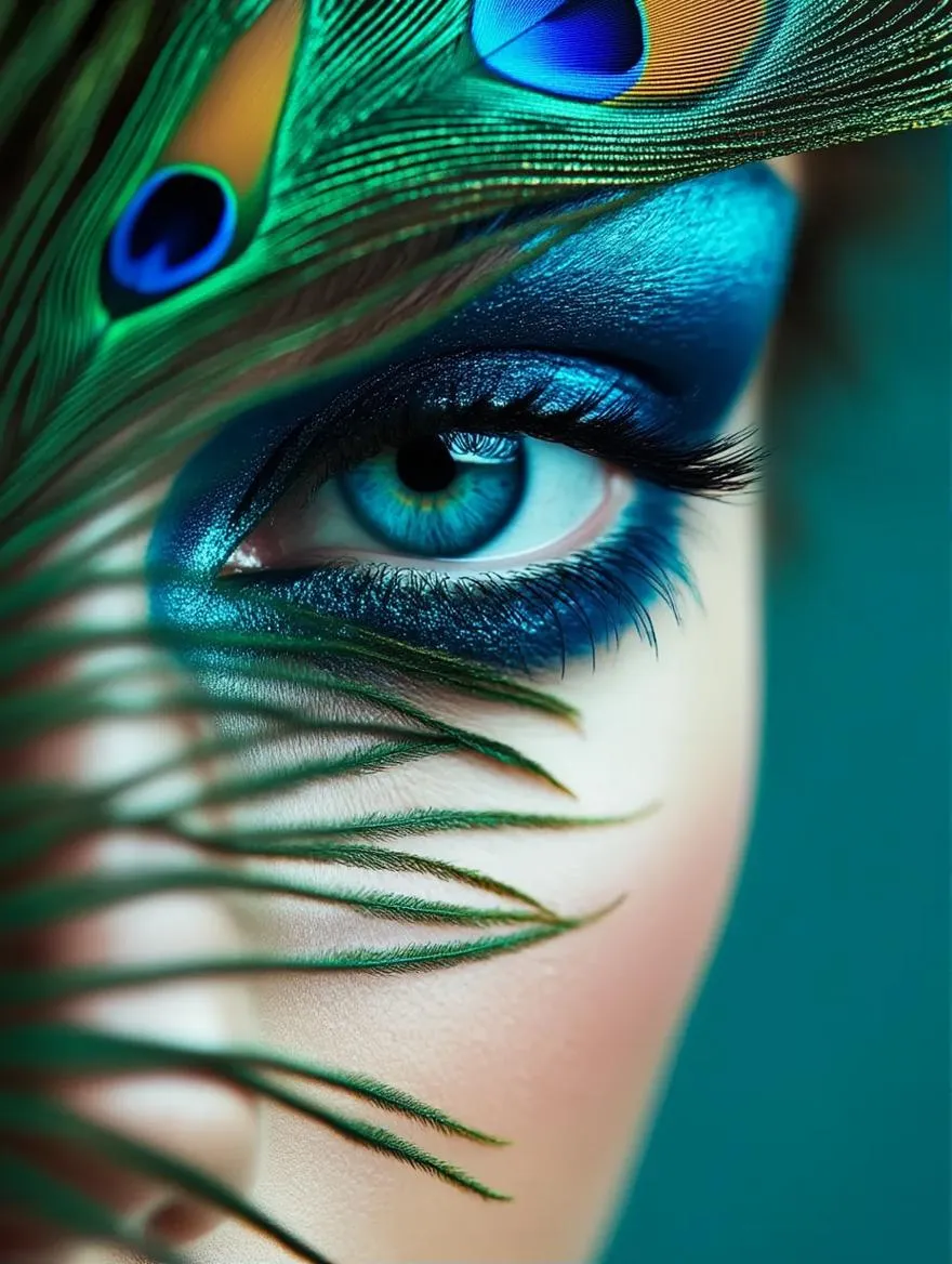 Create a surreal, high-contrast portrait with peacock feather face art using AI. Generate vibrant blue makeup, intricate feather textures, and dramatic shadows against a teal backdrop. Perfect for avant-garde fashion photography with mysterious atmosphere and creative composition. Explore AI-powered artistic effects for striking visual storytelling.