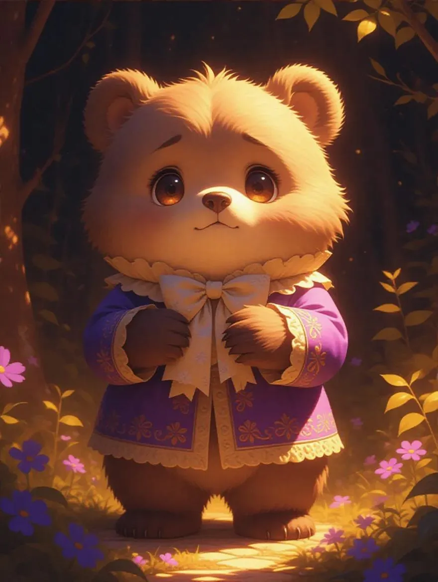 Create stunning AI-generated art of an emotional bear with fluffy fur and an adorable outfit, featuring teary eyes and a gentle frown. Set in a mystical forest with warm lighting, styled like Rebecca Guay, Loish, and Ruan Jia's dreamy watercolors and digital art. Perfect emotional character AI image.