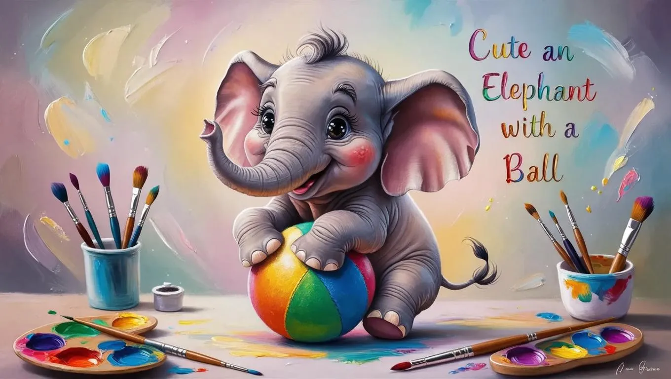 Create a charming AI-generated painting of a cute elephant playfully interacting with a ball, featuring vivid colors and whimsical details. Vivago.ai transforms text prompts into professional-grade visuals with advanced AI effects and editing tools. Unleash your creativity with seamless text-to-image AI art generation.