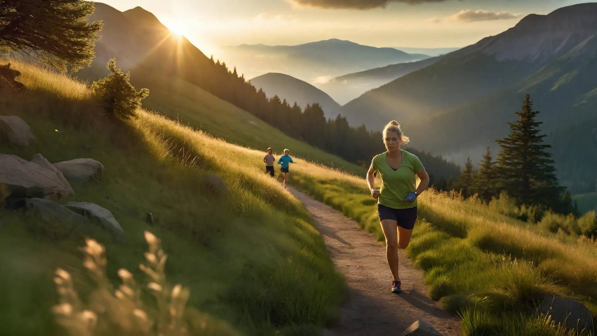 Capture stunning sunset mountain landscapes with AI-generated realism. This vibrant scene features trail runners mid-stride on a winding path through lush green hills, bathed in golden hour warmth. Perfect for outdoor enthusiasts and content creators seeking dynamic nature photography emphasizing depth, athletic motion, and rich color contrasts between grassy slopes and fiery twilight skies.