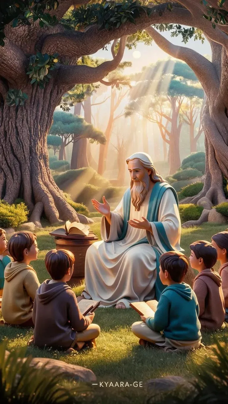 Create serene AI-generated art with vivago.ai: A wise mentor guides eager learners under ancient trees in soft pastel KYARA-GE style. Warm sunlight, intricate details, and 4K resolution bring this peaceful educational scene to life. Perfect for inspirational digital projects, blending AI effects and artistic precision for professional-grade visual storytelling.