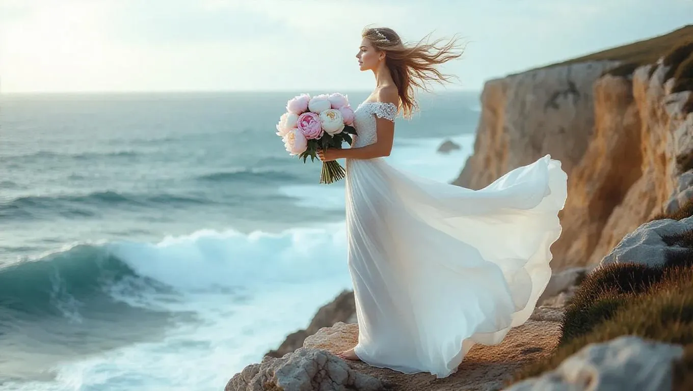 Create stunning AI-generated art of a serene woman in a flowing dress standing on a cliff overlooking the ocean. Capture ethereal beauty, dramatic coastal landscapes, and vibrant peony bouquets with professional AI tools for romantic, nature-inspired imagery.