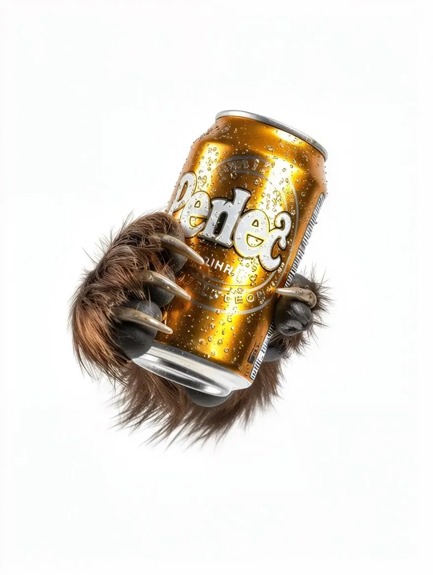 Generate hyper-realistic AI images of a brown bear paw gripping a 0.33L beer can against a clean white background. Perfect for ads, humor concepts, or product showcases. Studio lighting highlights every claw and can detail. Create unique animal-brand fusion visuals instantly with vivago.ai.