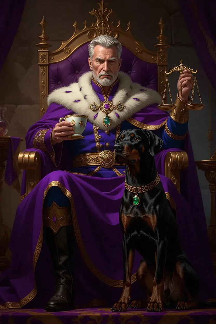 Experience AI-generated art of a compassionate king with a justice scale and golden cup, draped in a regal purple-blue cape. Enthroned with a loyal black Doberman beside him, adorned with a spiked green leash. Create striking, symbolic royalty visuals using Vivago.ai's AI image tools for professional, imaginative results from text prompts.