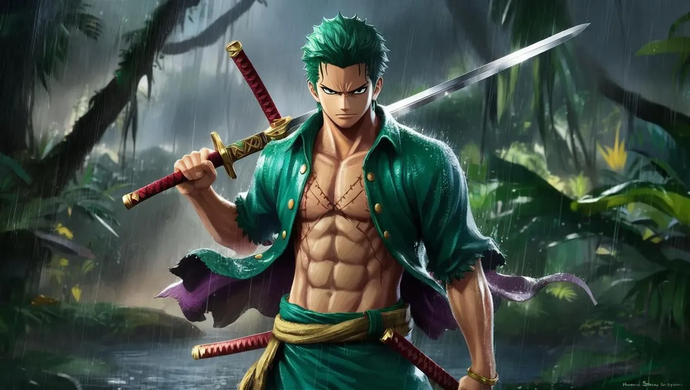 Generate a realistic AI image of Zoro from One Piece wielding three swords in a lush rainforest. Vivago.ai transforms text prompts into dynamic, full-body anime art with professional-grade AI effects for vibrant, high-detail character visuals and immersive storytelling.