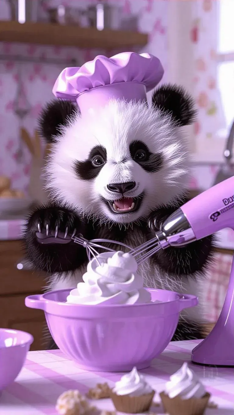 The lovely baby panda, having soft fur and a curly hairstyle, sports a frilly hat and stands in a retro kitchen. It whips a lavender bowl of mousse with an electric mixer, surrounded by dessert components. The panda's movements are brisk and jubilant, creating a fluffy mix with enthusiasm. The scene captures the panda's delight, gliding to show off the playful kitchen setup.