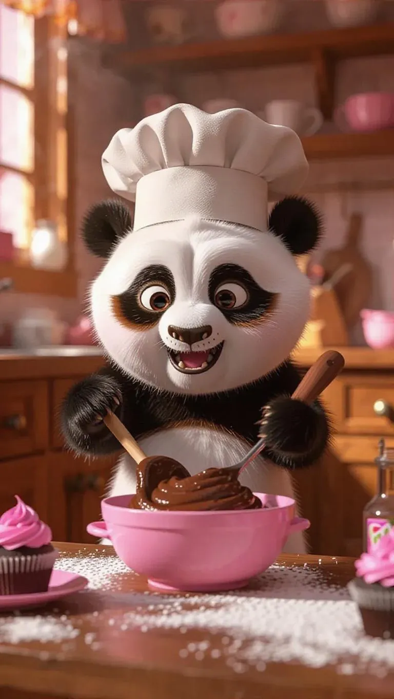 The charming baby panda, with its silky fur and wave hairstyle, wears a chef's toque and enters a bright kitchen. It stirs a pink bowl of brownie batter with a cupcake-shaped spatula, surrounded by yummy toppings. The panda's process is fun and lively, blending the dough with zeal. The camera focuses on the panda's thrill, slightly tilting to reveal the playful kitchen environment.