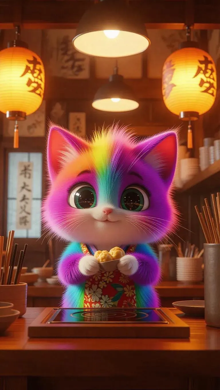A lovable small critter from a surreal universe, with a colorful, fluffy coat and large, shiny eyes. Located in a stylish kitchen of an upscale sushi restaurant, creating katsu and tempura. The environment features recognizable Japanese characteristics: lanterns lining the walls, chef's knives, unique sake glasses, and swirling wind.