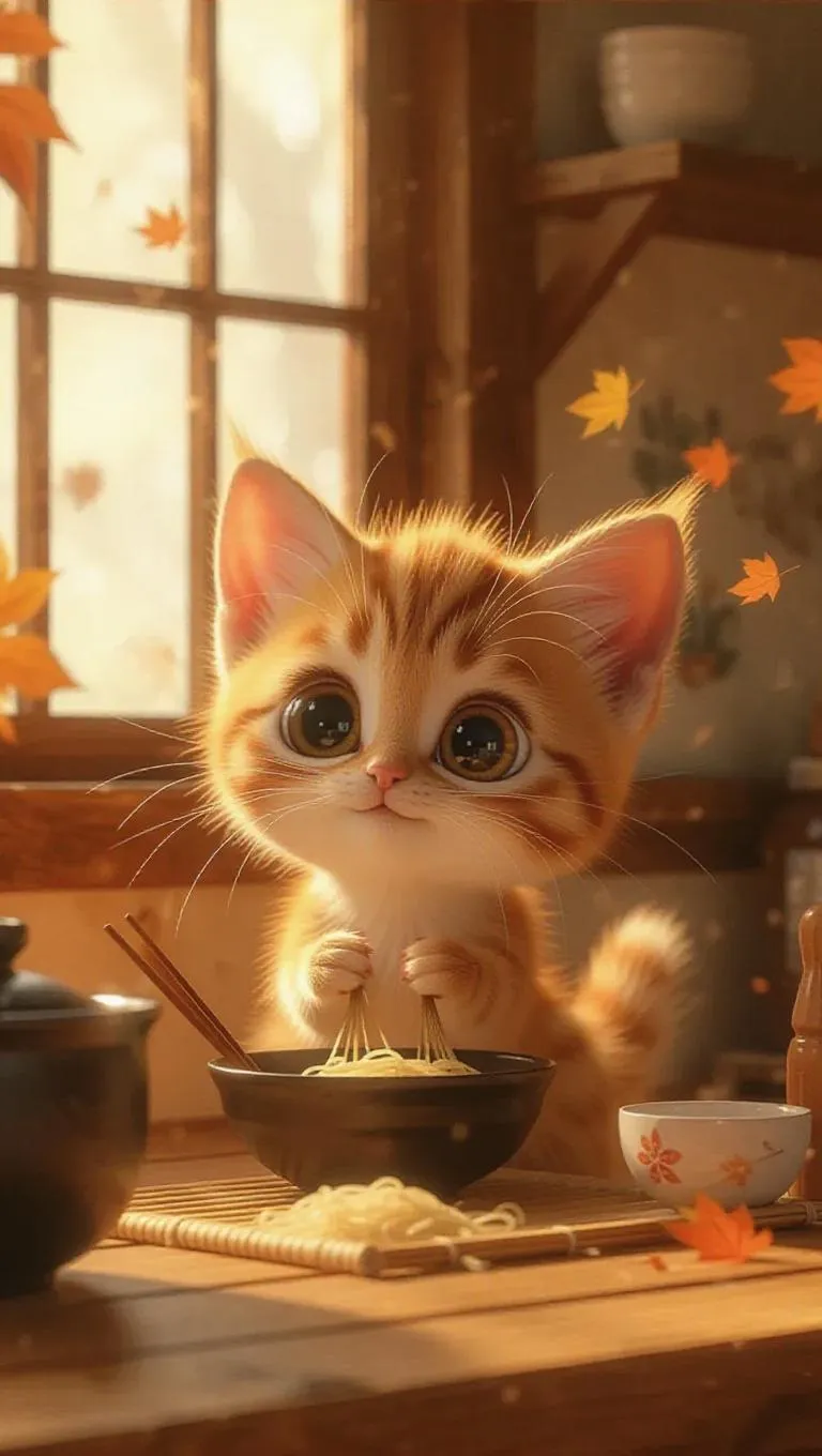 A charming little being from an imaginary world, with a radiant, lively coat and big, sparkling eyes. Found in a small kitchen of a countryside eatery, making udon and tama. The setup has typical Japanese elements: wooden beams, tatami mats, slender incense sticks, and drifting leaves.