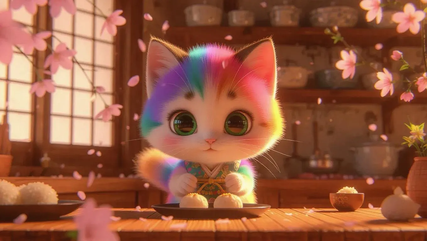 A precious tiny being from a dreamy world, with a lively, multicolored fur and enchanting, large eyes. Discovered in a cozy kitchen of a traditional noodle house, preparing soba and onigiri. The scene features quintessential Japanese decor: etched doors, hanging walls, wooden shelves, and falling cherry petals.