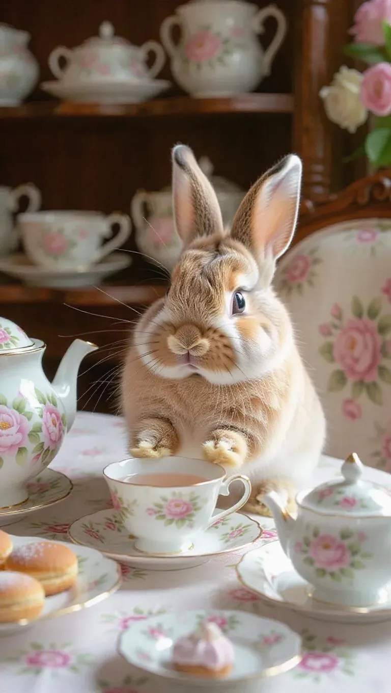 A lively little rabbit from a whimsical meadow, with fluffy white fur and sparkling pink eyes, found in a charming tea room. Brewing herbal teas and arranging pastries, surrounded by floral patterns, delicate china, pastel decor, and calming fragrances.