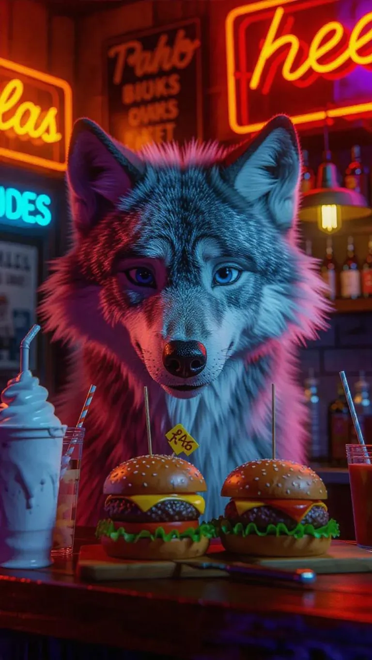 A mischievous little wolf from a legendary tundra, with sleek silver fur and intense blue eyes, found in a trendy burger joint. Grilling gourmet burgers and crafting milkshakes, surrounded by vintage signage, colorful condiments, neon lights, and sizzling sounds.