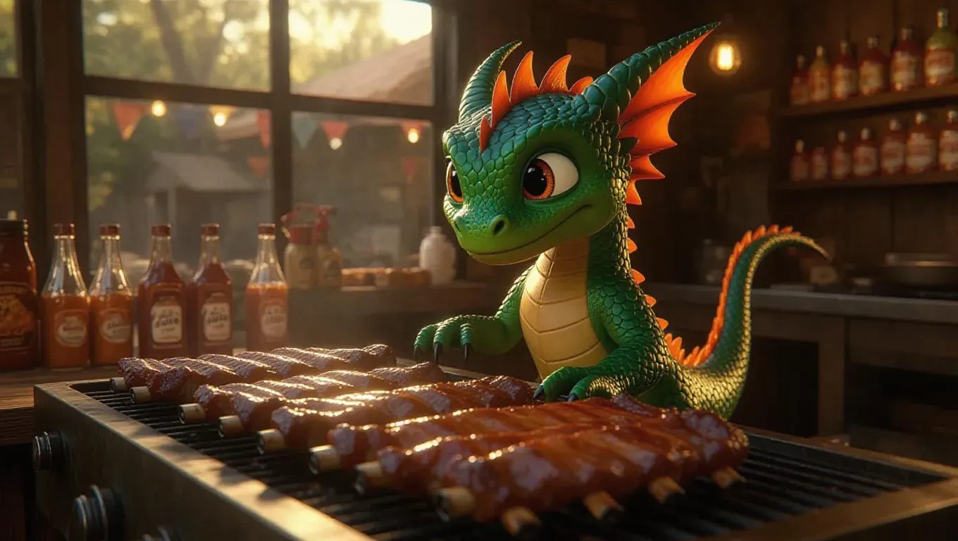 A playful little dragon from a legendary mountain, with brilliant green scales and fiery orange eyes, found in a vibrant barbecue joint. Grilling ribs and crafting sauces, surrounded by wooden decor, vibrant condiments, outdoor seating, and lively music.