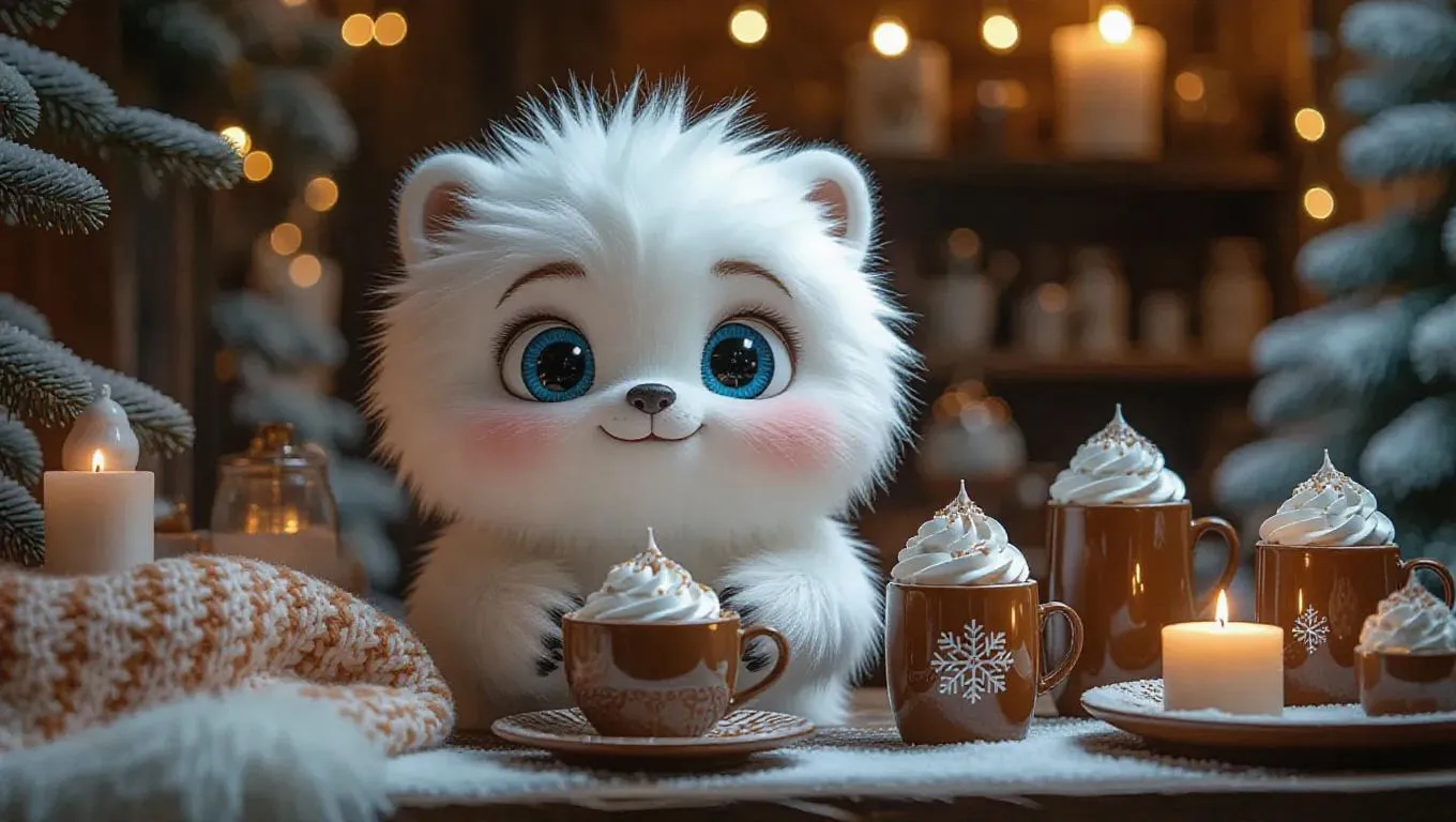 A delightful little yeti from a snowy peak, with fluffy white fur and bright blue eyes, discovered in a cozy hot chocolate shop. Making gourmet hot chocolates and sweet toppings, surrounded by winter decor, warm blankets, and inviting smells.