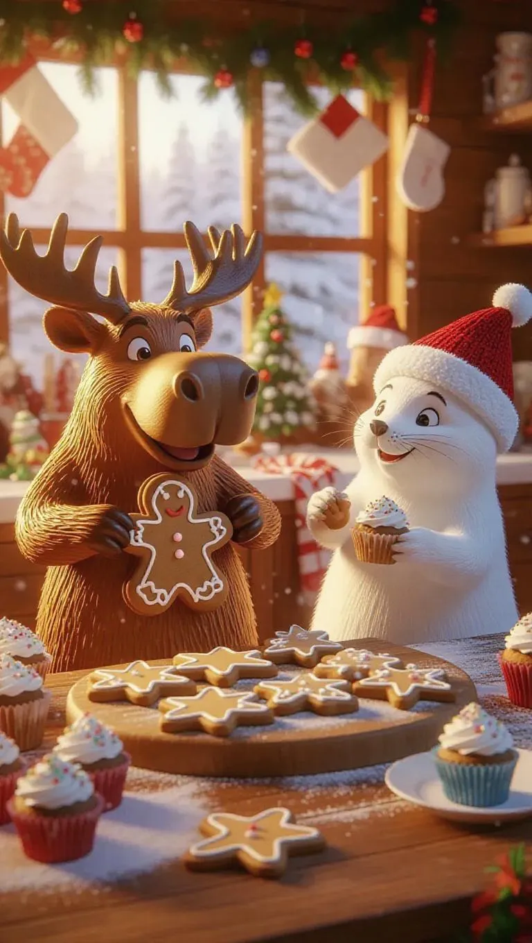 A vibrant holiday kitchen scene featuring a moose, seal, and chipmunk baking together. The moose shapes gingerbread cookies, the seal stirs frosting earnestly, and the chipmunk sprinkles toppings on cupcakes. Bright wooden counters, festive decorations, and winter hats. Merry, glowing atmosphere with playful touches like a cookie hanging from the moose's antlers and the chipmunk nibbling on sprinkles.