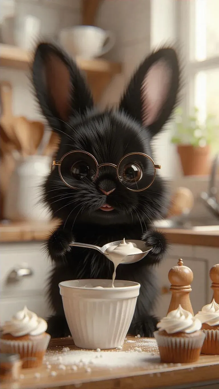 Miniature baby bunny 3D realistic, black fur with floppy ears, wearing glasses, in a cozy kitchen, pouring batter into cupcake liners with a ladle, surrounded by baking tools, he is in his paradise, radiating focus and creativity