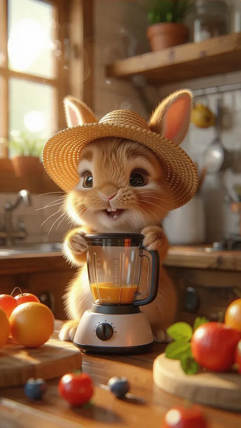 Miniature baby bunny 3D realistic, tan fur with floppy ears, wearing a sun hat, in a cozy kitchen, blending ingredients in a blender, surrounded by colorful fruits, he is in his retreat, radiating happiness and contentment