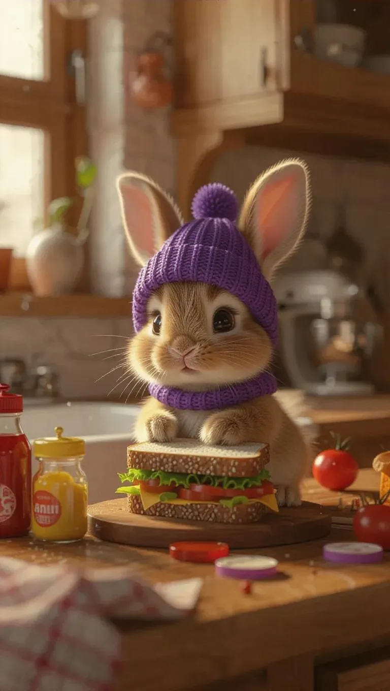 Miniature baby bunny 3D realistic, lilac fur with floppy ears, wearing a beanie, in a cozy kitchen, preparing a sandwich on the counter, surrounded by condiments, he is in his domain, radiating playful energy