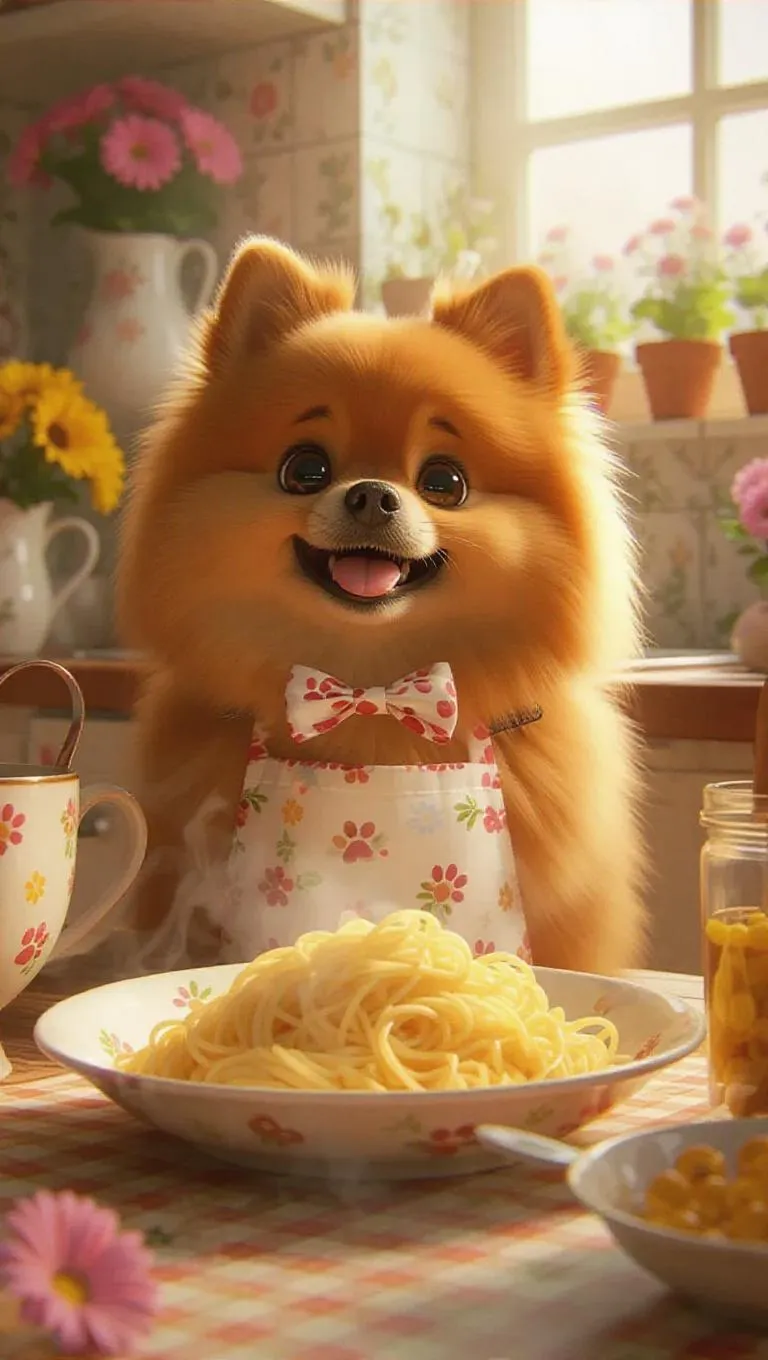 A very sweet brown Pomeranian with a fluffy coat and playful eyes, wearing a cheerful garden apron with a playful bow. She prepares delicious Italian pasta, beautifully presented and steaming hot, with the puppy wagging its tail excitedly. The scene unfolds in a cozy cottage kitchen, decorated with bright flower arrangements, paw prints, treats, and garden-themed decorations.