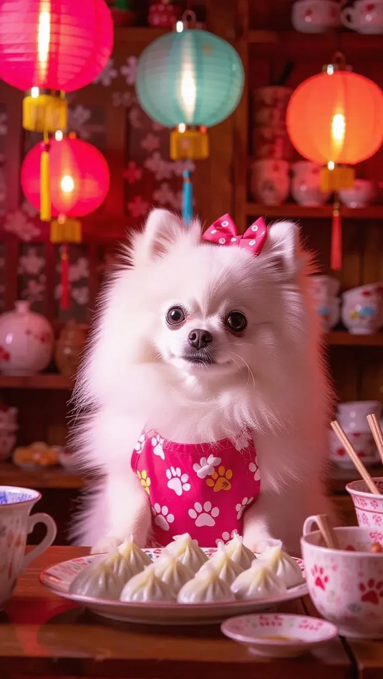 A very sweet white Pomeranian with a silky coat and bright eyes, wearing a vibrant chef's apron with a cute bow. She prepares scrumptious Japanese dumplings, artistically arranged and steaming hot, with the puppy sniffing eagerly. The scene unfolds in a whimsical tiny kitchen, filled with colorful lanterns, paw prints, fish toys, and culinary-themed decorations.