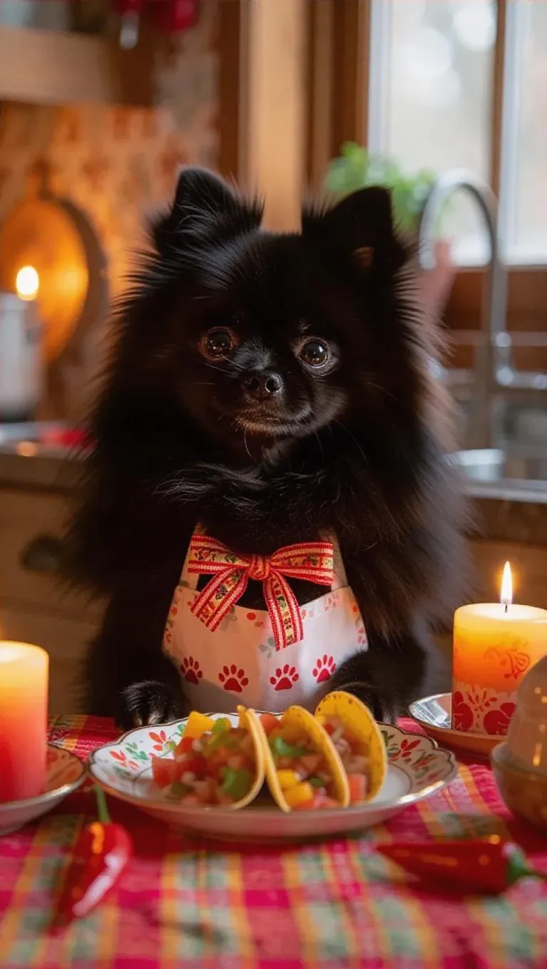 A very sweet black Pomeranian with a fluffy coat and curious eyes, wearing a stylish baking apron with a lovely bow. She prepares delightful Mexican tacos, served beautifully and hot, with the puppy sitting patiently. The scene unfolds in a quaint home kitchen, illuminated by soft candles, paw prints, chili pepper decorations, and vibrant colors.