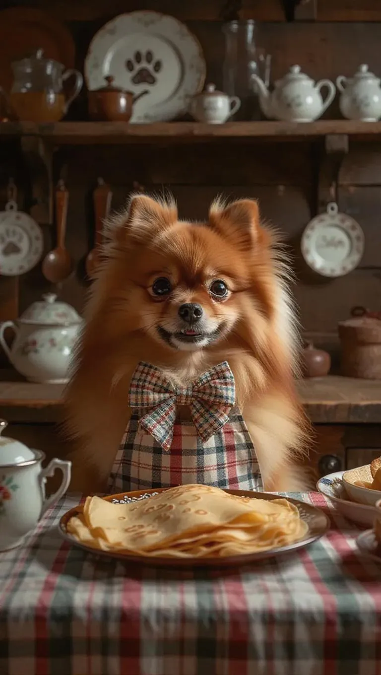 A very sweet golden Pomeranian with a soft coat and bright expressive eyes, wearing a simple plaid apron with a tiny bow. She prepares hearty French crepes, artfully plated and steaming on the table, with the puppy gazing longingly. The scene unfolds in a rustic kitchen, adorned with vintage cookware, paw prints, and culinary-themed decorations.