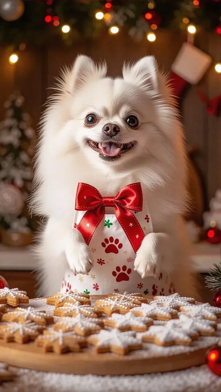 A very sweet silver Pomeranian with a cloud-like coat and bright eyes, wearing a festive holiday apron with a cheerful bow. She prepares traditional holiday cookies, perfectly arranged and steaming fresh, with the puppy jumping excitedly. The scene unfolds in a festive kitchen, adorned with holiday lights, paw prints, and festive decorations.
