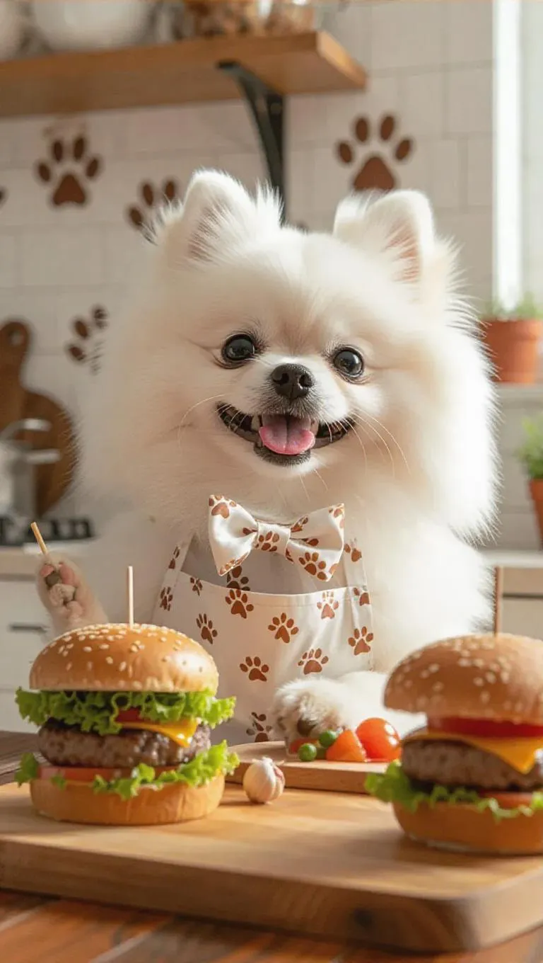 A very sweet white Pomeranian with a fluffy coat and playful eyes, wearing an elegant dinner apron with a beautiful bow. She prepares gourmet gourmet burgers, stacked high and steaming, with the puppy licking its lips. The scene unfolds in an upscale kitchen, decorated with contemporary art, paw prints, and gourmet-themed designs.