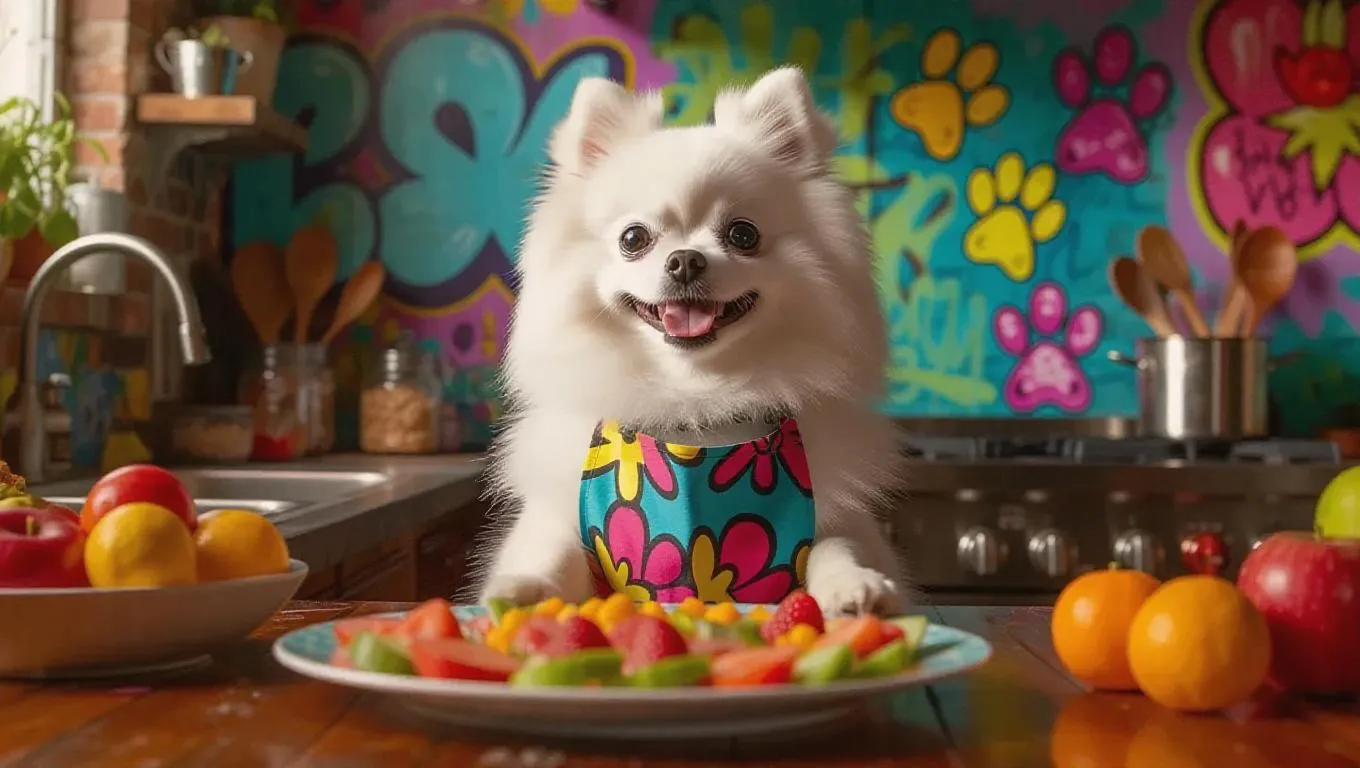 A very sweet white Pomeranian with a soft coat and dazzling eyes, wearing an artistic graffiti apron with a cool bow. She prepares colorful fruit platters, artistically arranged and refreshing, with the puppy playfully jumping. The scene unfolds in an urban kitchen, adorned with street art, paw prints, and vibrant decorations.