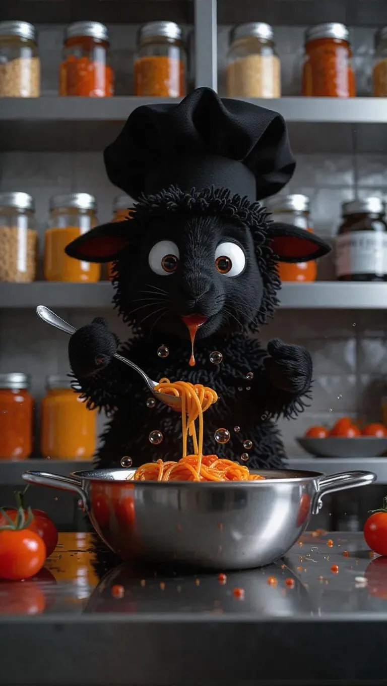 A cartoonish pure black lamb in a chef’s hat stands at a small mixing bowl, pouring cold, tangy tomato sauce over cooked spaghetti, bubbles rising. It stirs with a tiny metal spoon, ensuring every piece is perfectly coated, creating a delicious aroma. Modern, sleek kitchen, stainless steel shelves filled with jars of sauces and oils