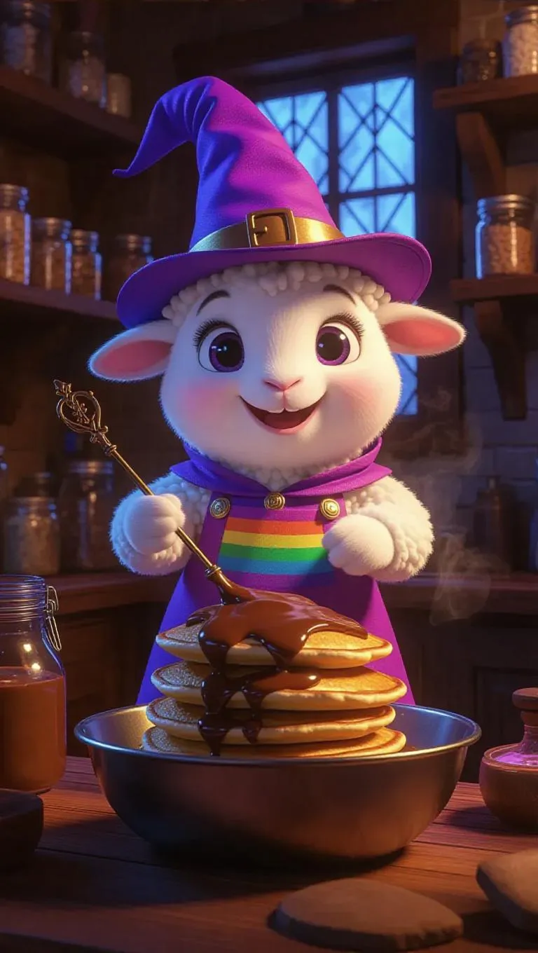 A cartoonish rainbow-colored lamb in a wizard's hat stands at a giant mixing bowl, pouring thick, sweet chocolate sauce over cooked pancakes, steam swirling. It stirs with an ornate wand, ensuring every layer is perfectly coated, creating a decadent aroma. Magical, enchanted kitchen, floating shelves filled with jars of mystical ingredients