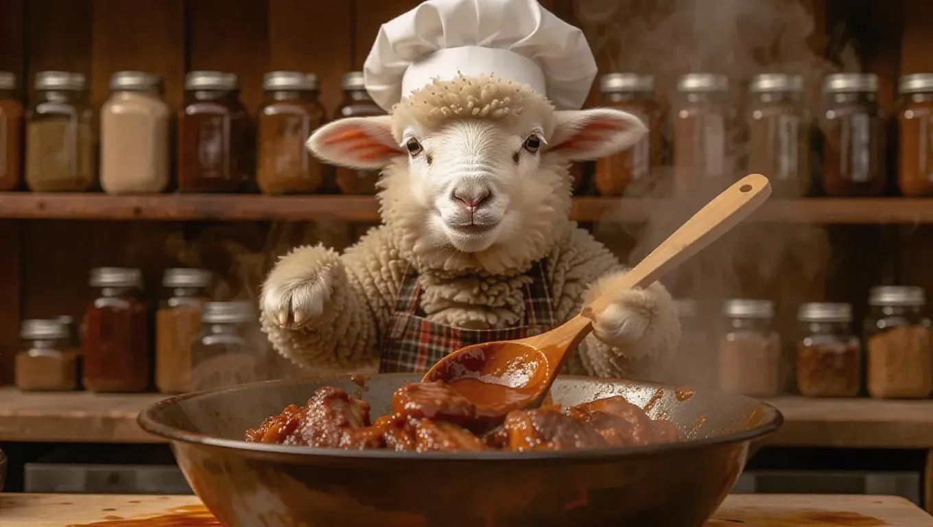 A fluffy gray lamb in a chef's bandana stands at a large bowl, pouring tangy barbecue sauce over cooked pork, steam wafting. It stirs with a large wooden spoon, ensuring every piece is perfectly coated, creating an appetizing aroma. Outdoor, backyard kitchen, shelves filled with jars of grilling spices