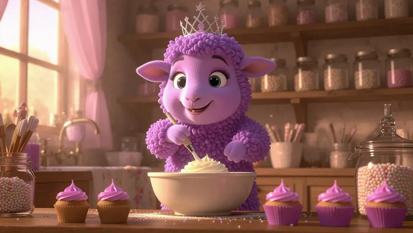 A cartoonish lavender lamb in a tiara stands at a large mixing bowl, pouring sweet vanilla icing over decorated cupcakes, steam hinting sweetness. It stirs with a delicate piping tool, ensuring every cupcake is perfectly coated, creating a sugary aroma. Festive, party kitchen, shelves filled with jars of sprinkles and decorations