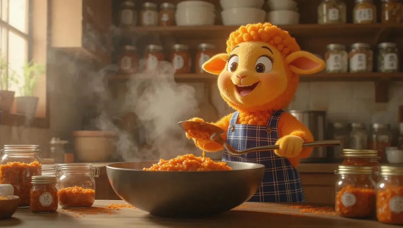 A cheerful orange lamb in an apron stands at a large bowl, pouring spicy kimchi sauce over cooked rice cakes, steam spiraling. It stirs with a large spoon, ensuring every bite is perfectly coated, creating a zesty aroma. Ethnic, Korean kitchen, shelves filled with jars of traditional ingredients