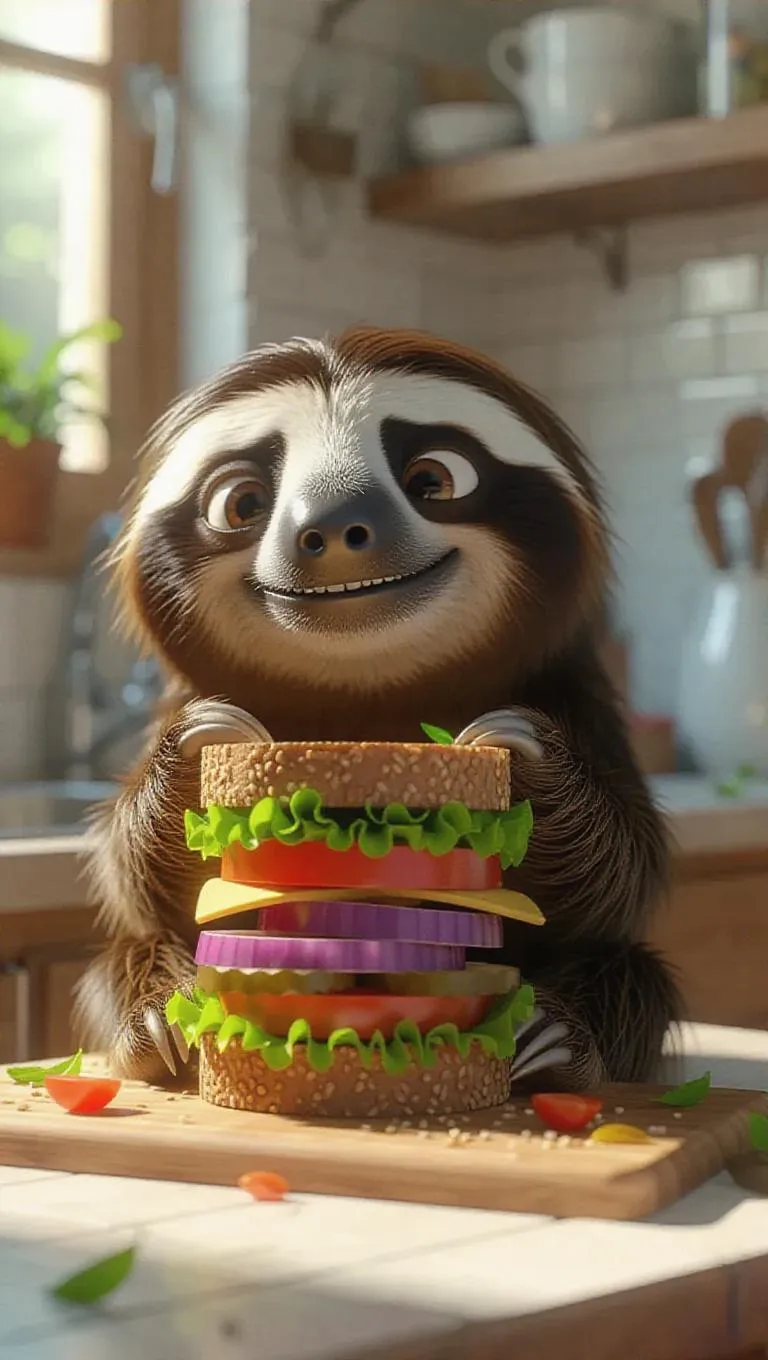The sweet cartoon fluffy sloth sits on a kitchen counter, assembling a sandwich with its paws. Its satisfied smile and the assortment of colorful toppings create a cheerful and friendly kitchen atmosphere. The camera glides from the sloth’s face to the towering sandwich, emphasizing the vibrant ingredients and the sloth’s careful placement.