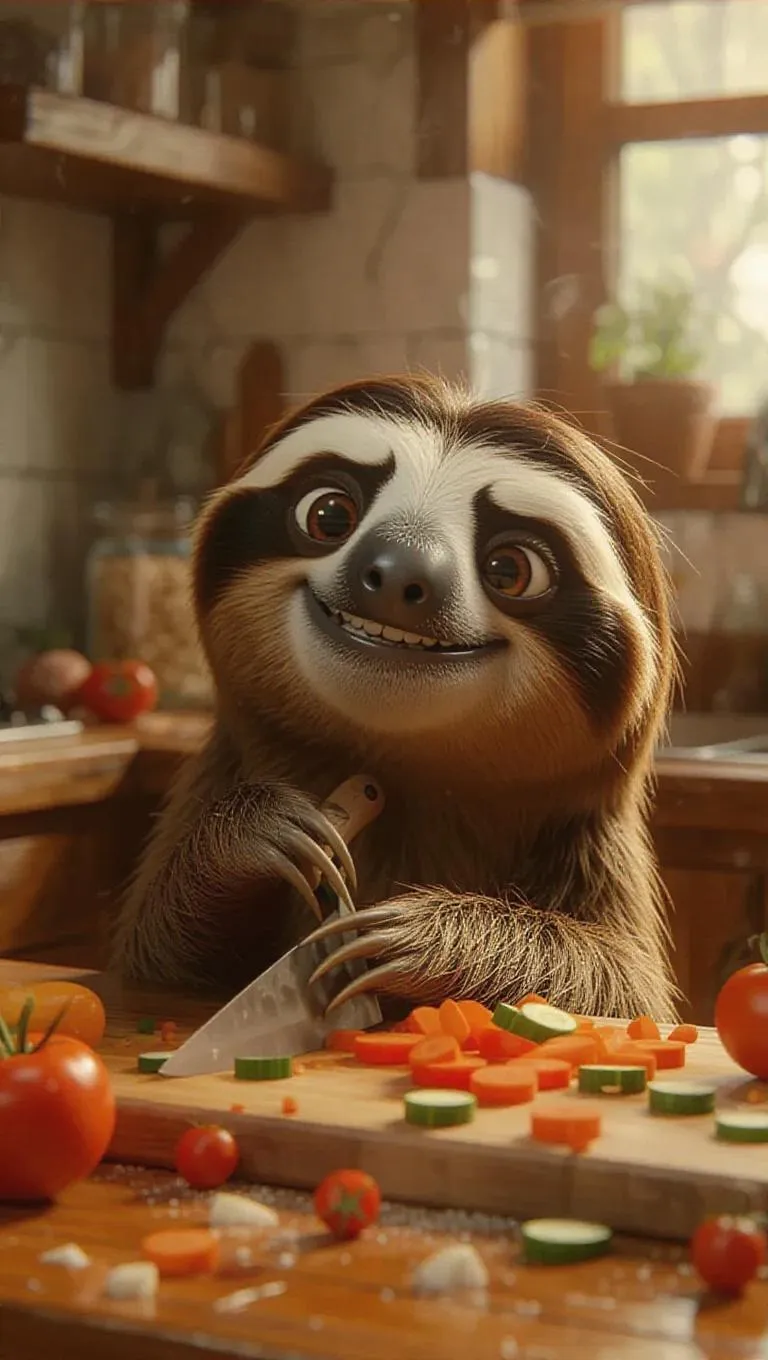 The whimsical cartoon fluffy sloth leans against a chopping board, slicing vegetables for a stew. Its focused expression and the round veggies scattered around offer a homely and cheerful kitchen environment. The camera pans from the sloth’s grinning face to the cutting board, showcasing the crisp sounds and vibrant colors of the ingredients.