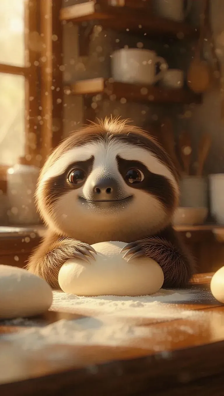 The adorable cartoon fluffy sloth occupies a cozy corner, folding fresh dough for buns. Its serene expression and flour dusting the counter create a warm and welcoming kitchen scene. The camera transitions from the sloth’s content face to the kneaded dough, emphasizing the texture and the sloth's gentle handling.