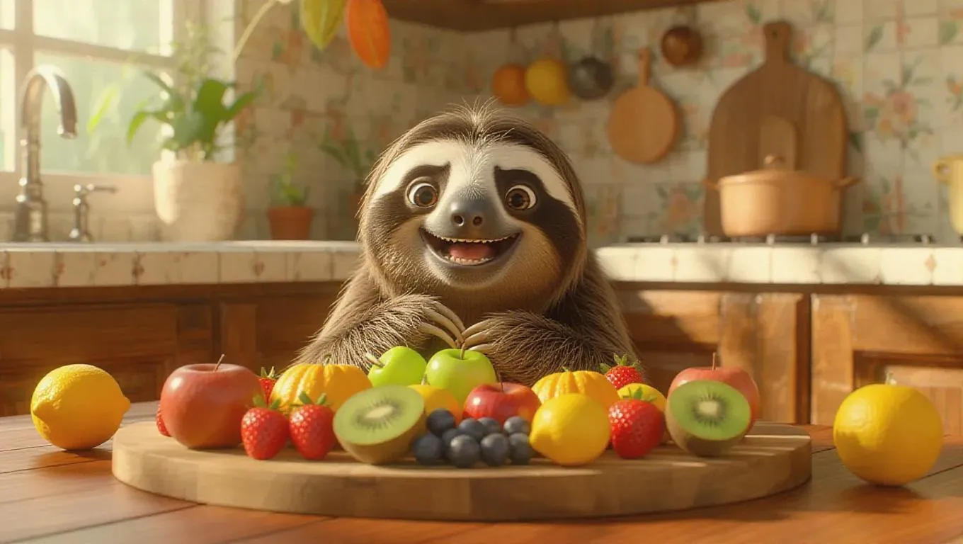 The cute cartoon fluffy sloth crouches beside a wooden table, arranging fruits for a colorful fruit platter. Its joyous expression and vibrant colors of the fruits create an appetizing and cheerful kitchen setting. The camera glides from the sloth’s smiling face to the beautifully arranged platter, showcasing the enticing presentation.