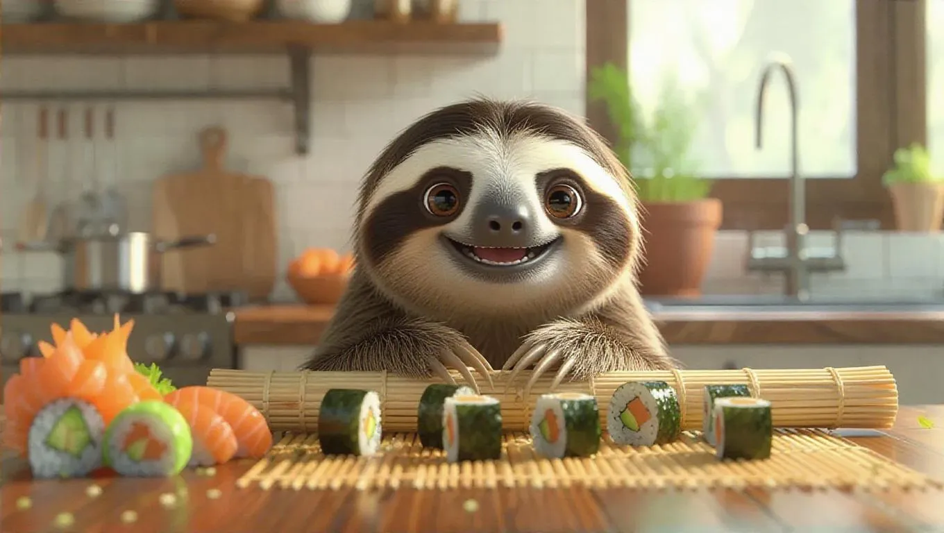 The playful cartoon fluffy sloth is situated by a countertop, preparing colorful sushi rolls with a bamboo mat. Its cheerful demeanor and fresh ingredients scattered around enhance the exotic kitchen ambiance. The camera slides from the sloth’s excited face to the rolling mat, displaying the crafty assembly and the sloth’s meticulous focus.