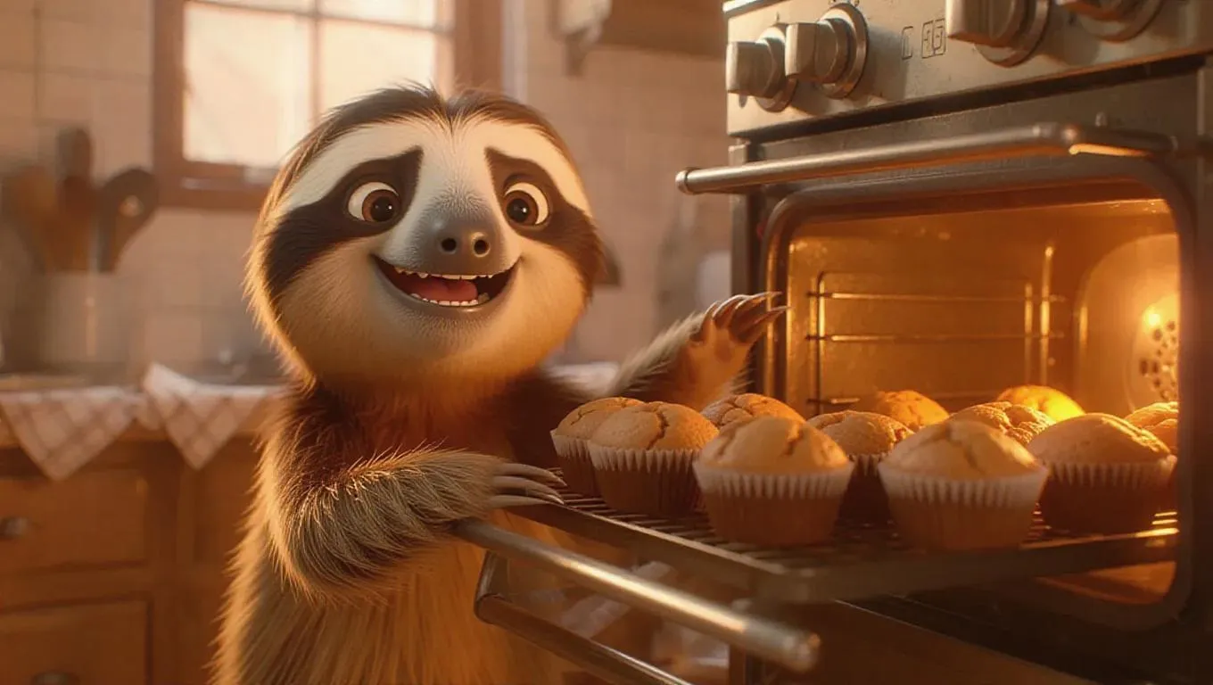 The charming cartoon fluffy sloth stands beside an open oven, pulling out a tray of freshly baked muffins with care. Its happy expression and the warm aroma rising evoke a homely and inviting kitchen feel. The camera zooms from the sloth’s delighted face to the golden muffins, capturing the mouthwatering treat.