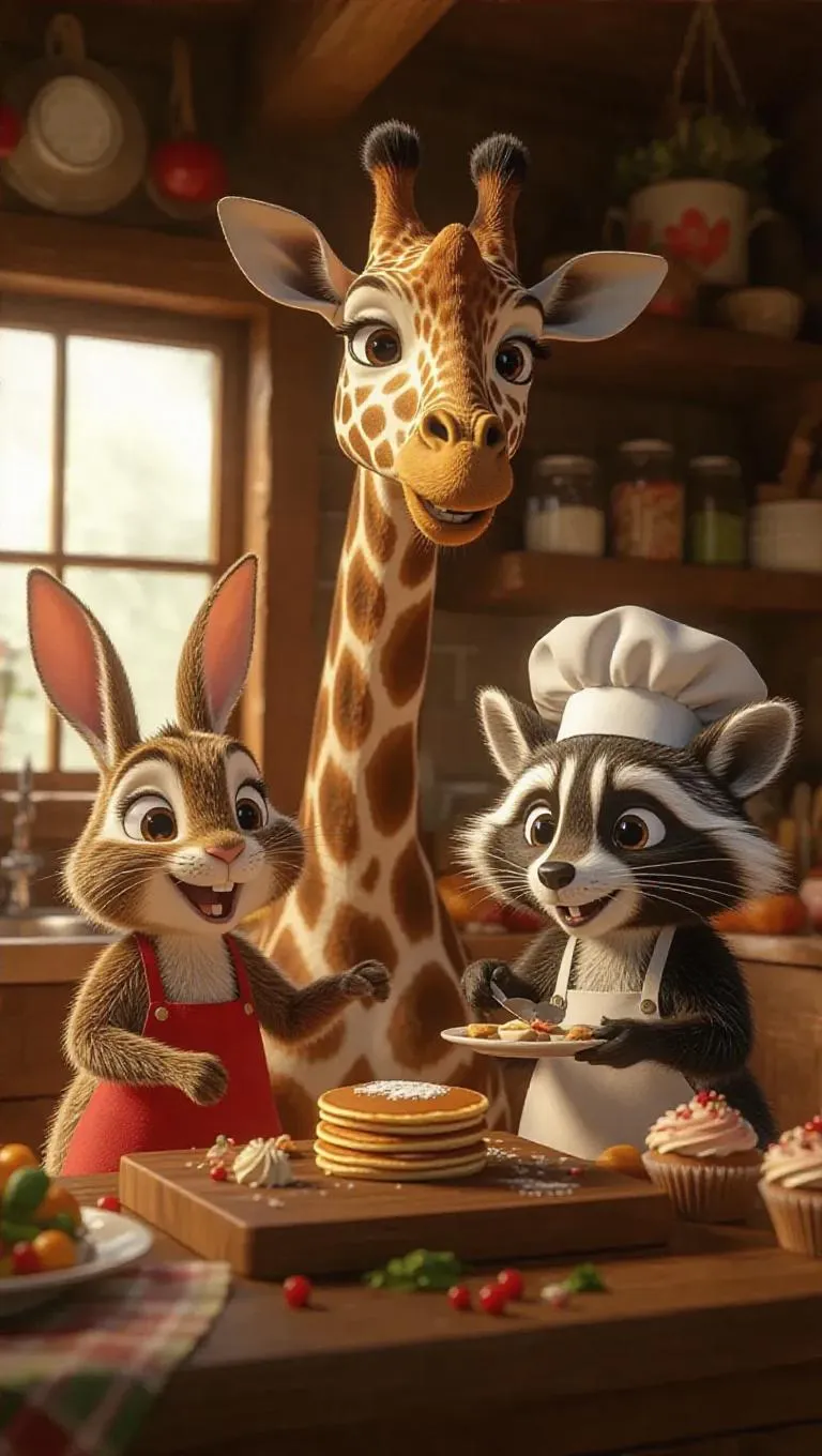 A whimsical kitchen scene featuring a giraffe, rabbit, and raccoon cooking together. The giraffe skillfully flips pancakes, the rabbit chops vegetables with speed, and the raccoon frosts cupcakes. Rustic wooden counters, colorful ingredients, and adorable chef hats. Bright, playful atmosphere with humorous touches like a pancake on the ceiling and the raccoon sneaking a bite. Animals exude excitement and concentration.