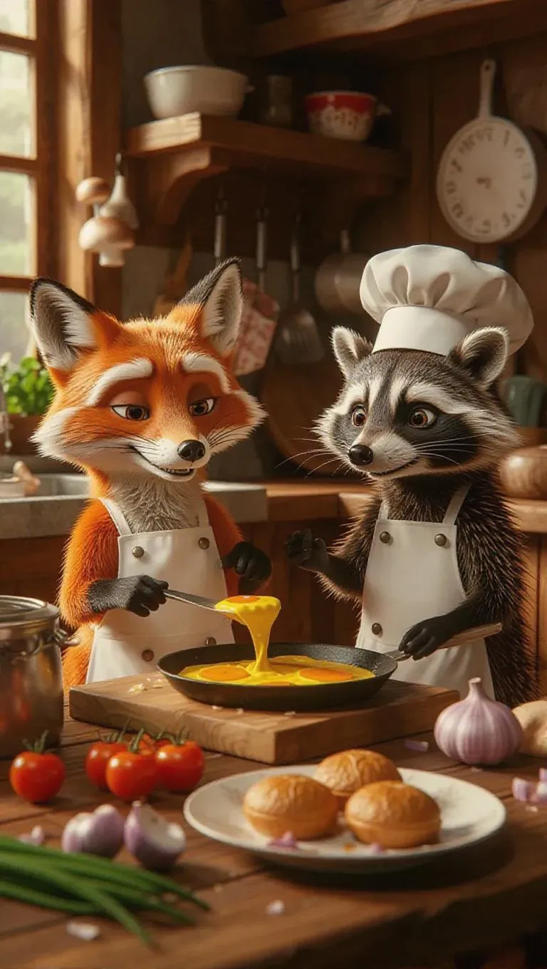 A whimsical kitchen scene featuring a fox, hedgehog, and raccoon cooking together. The fox skillfully flips omelets, the hedgehog slices onions with precision, and the raccoon glazes pastries. Rustic wooden counters, colorful vegetables, charming chef hats. Bright, playful atmosphere with humorous touches like a mushroom on the ceiling, raccoon eyeing the pastries.