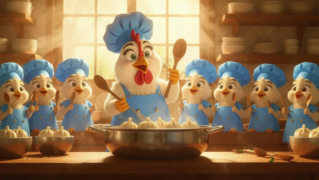 A cartoonish hen in a bright blue apron and chef hat cooks dumplings in a steaming pot in a warm, sunlit, tropical kitchen. Many baby hens, also in blue aprons and chef hats, hold wooden spoons and sit on the kitchen counter, eagerly watching the big hen